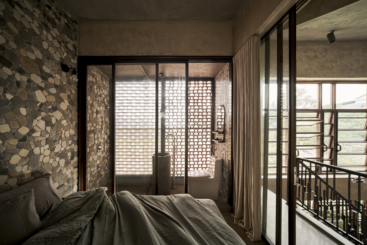 Ngoài hệ lam cửa lá sách kính gỗ, mặt lưng phía phòng ngủ còn sử dụng gạch lỗ nung đỏ nhằm tăng diện tích lấy gió nhưng vẫn đảm bảo sự riêng tư cần thiết.