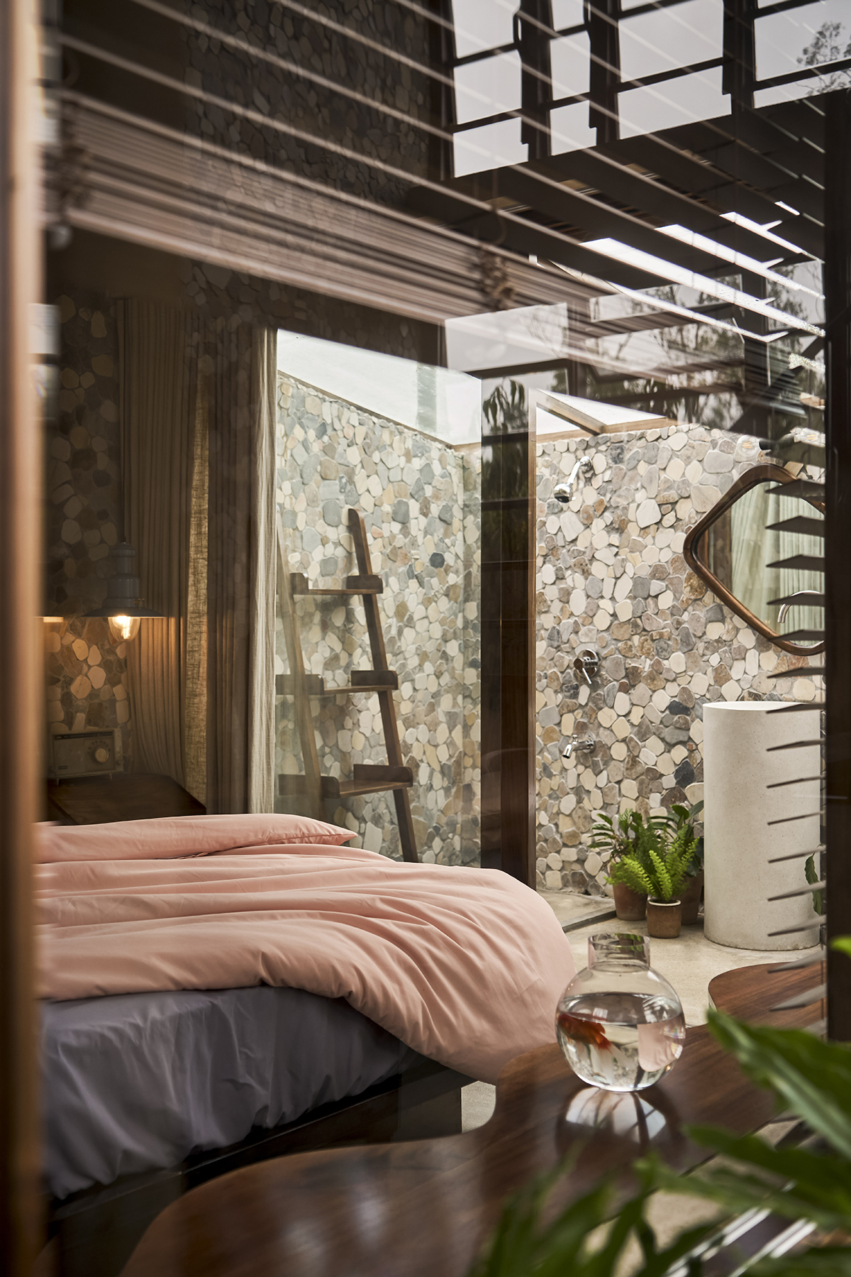 Ở phòng ngủ dành cho con gái có một phòng tắm lộ thiên. Kết hợp với cây cối được bố trí rải rác tạo thành không gian spa ngay tại nhà.