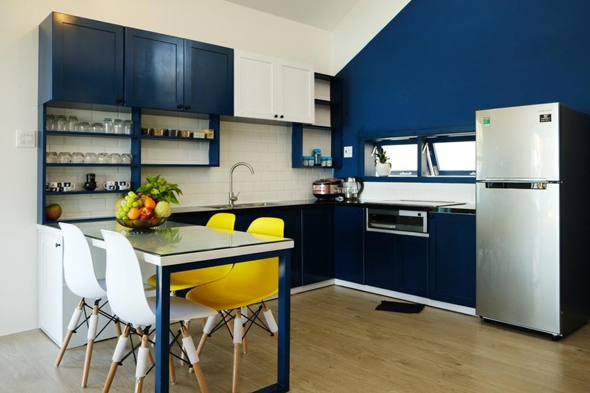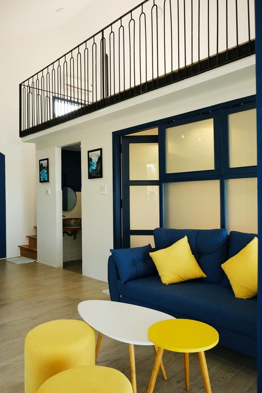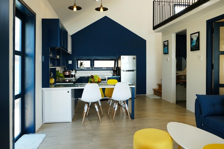 Nội thất căn nhà được thiết kế theo phong cách color - block (kết hợp từ hai đến nhiều khối màu), màu nền trắng, khung cửa và các vật dụng theo tone màu xanh dương chủ đạo, nhấn điểm một số vật dụng màu vàng.