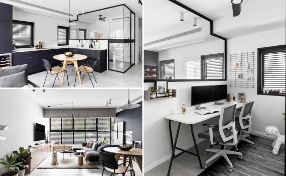 Nằm trong không gian chung, phòng làm việc tại nhà được giấu sau những bức tường kính, tường kính giúp ngăn cách phòng làm việc với các phòng khách / bếp / phòng ăn.