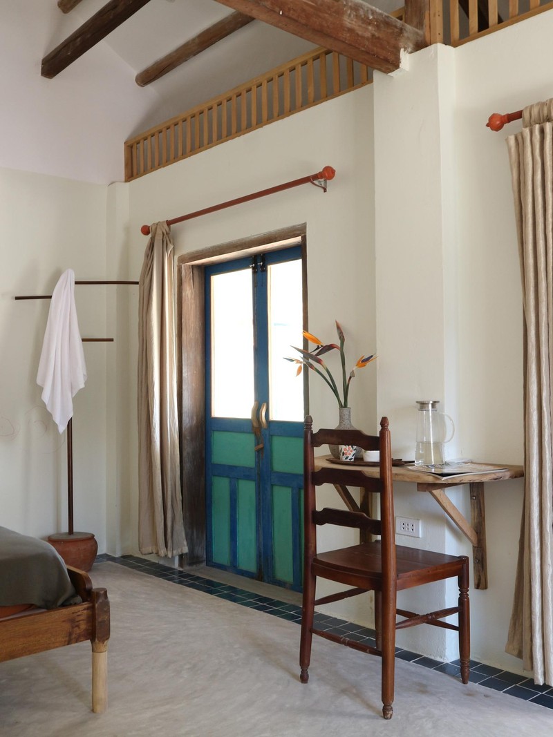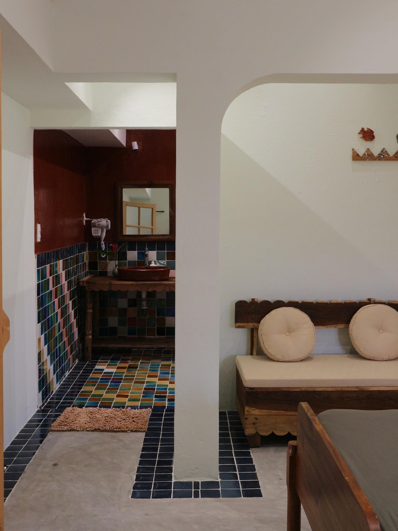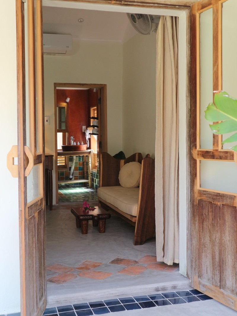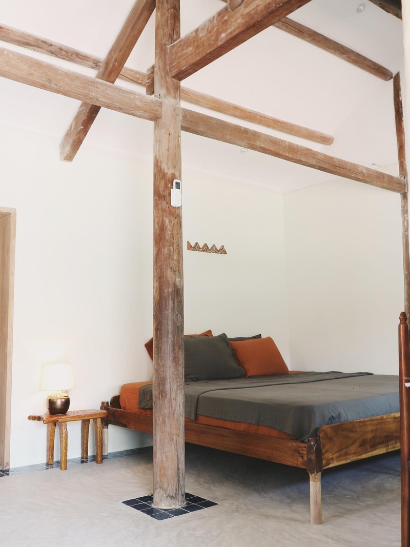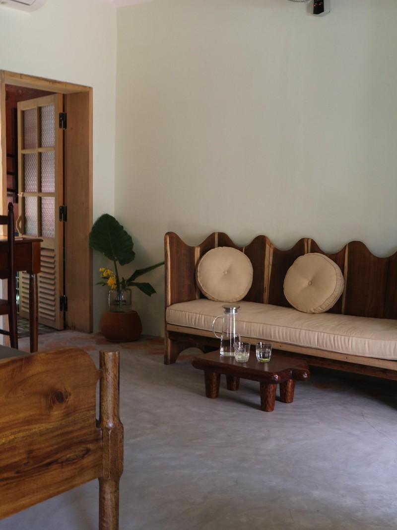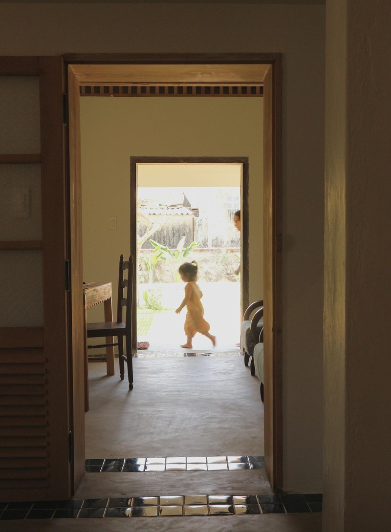 Nền nhà dùng bê-tông mài, viền xung quanh bằng gạch bông nhỏ làm điểm nhấn. Nội thất bằng gỗ do anh Tùng tự lên ý tưởng, thiết kế để phù hợp với bối cảnh không gian.