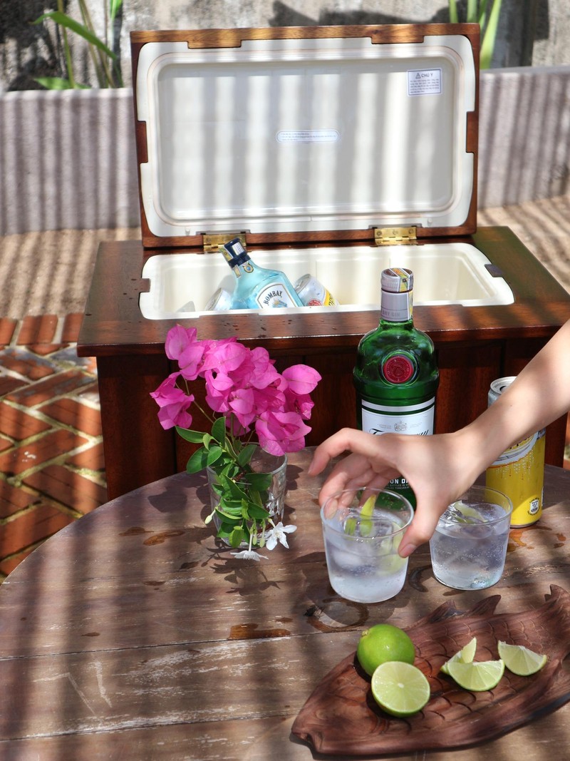 Những vật dụng bằng gỗ nhưng rất khác biệt, anh Tùng đều đặt riêng cho nhà, ví dụ như chiếc thùng đá độc đáo và đĩa gỗ hình con cá này.