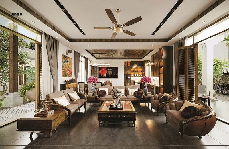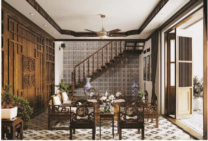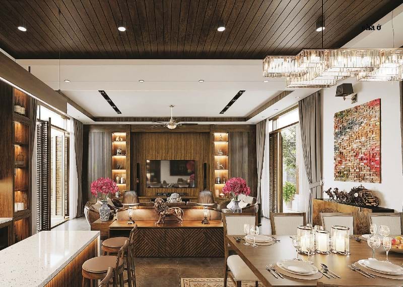 Không gian phòng khách được thiết kế một cách tinh tế, gần gũi bởi những chất liệu thân thuộc như gỗ tông màu nâu trầm, kết hợp với cửa lá sách truyền thống nhưng không hề thiếu sự sang trọng, ấm cúng.