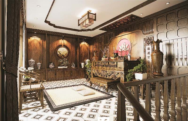 Tiếp nối tầng 1 với không gian hoài cổ là phòng thờ được bố trí nằm ở tầng 2. Trong các ngôi nhà truyền thống Việt Nam, không thể thiếu bàn thờ. Đây là nét văn hóa tín ngưỡng lâu đời của người bản địa, thể hiện đạo hiếu, tưởng nhớ tổ tiên. Vì vậy, kiến trúc sư đã mang đến không gian linh thiêng, trầm mặc và tôn nghiêm nhất.