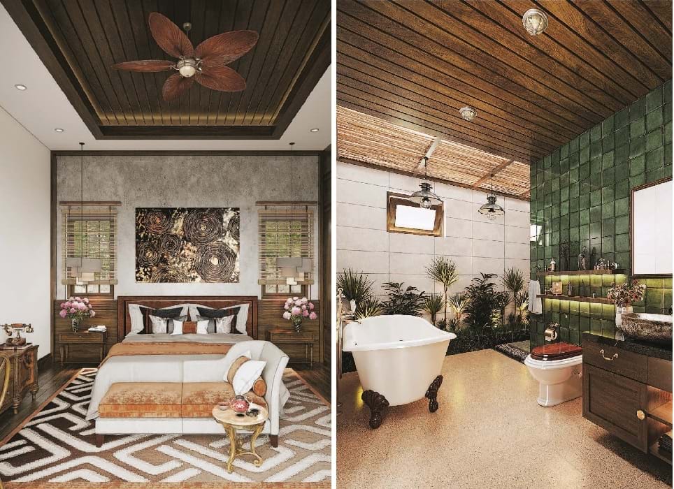 Không gian phòng tắm được thể hiện theo phong cách nhiệt đới, trần gỗ màu nâu trầm kết hợp gạch mosaic tông xanh lá mang đến một không gian thoáng mát.