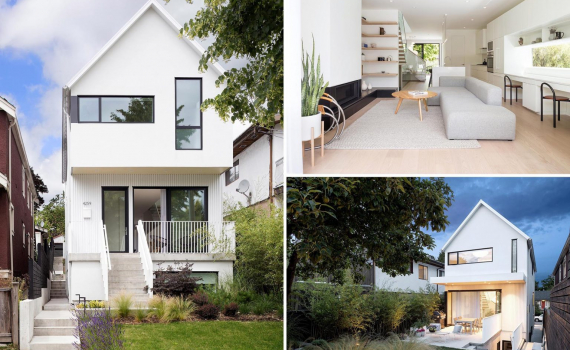 Nằm trong khu phố Mount Pleasant của Vancouver, Canada, ngôi nhà đẹp có ngoại thất màu trắng được ốp bằng vữa trơn sơn màu trắng, với mái có đường nối đứng bằng kim loại.