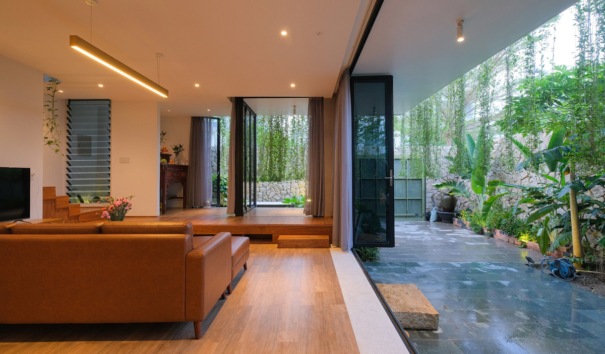 Phòng khách và bếp được kết nối liền mạch cùng hệ cửa trượt lớn, có tầm nhìn thẳng ra vườn cây xanh. Cách thiết kế ''trở về với tự nhiên"này mở ra toàn bộ không gian, cho phép ánh sáng tự nhiên truyền qua các phòng khác nhau và làm mờ ranh giới giữa các khu vực chức năng. Không gian sinh hoạt chung vì thế luôn thông thoáng, xanh mát, tạo cảm giác thư thái cho gia chủ.