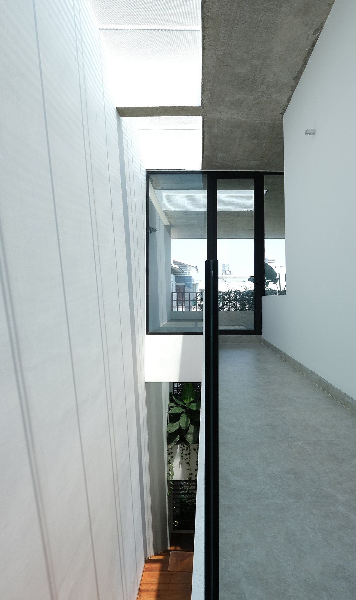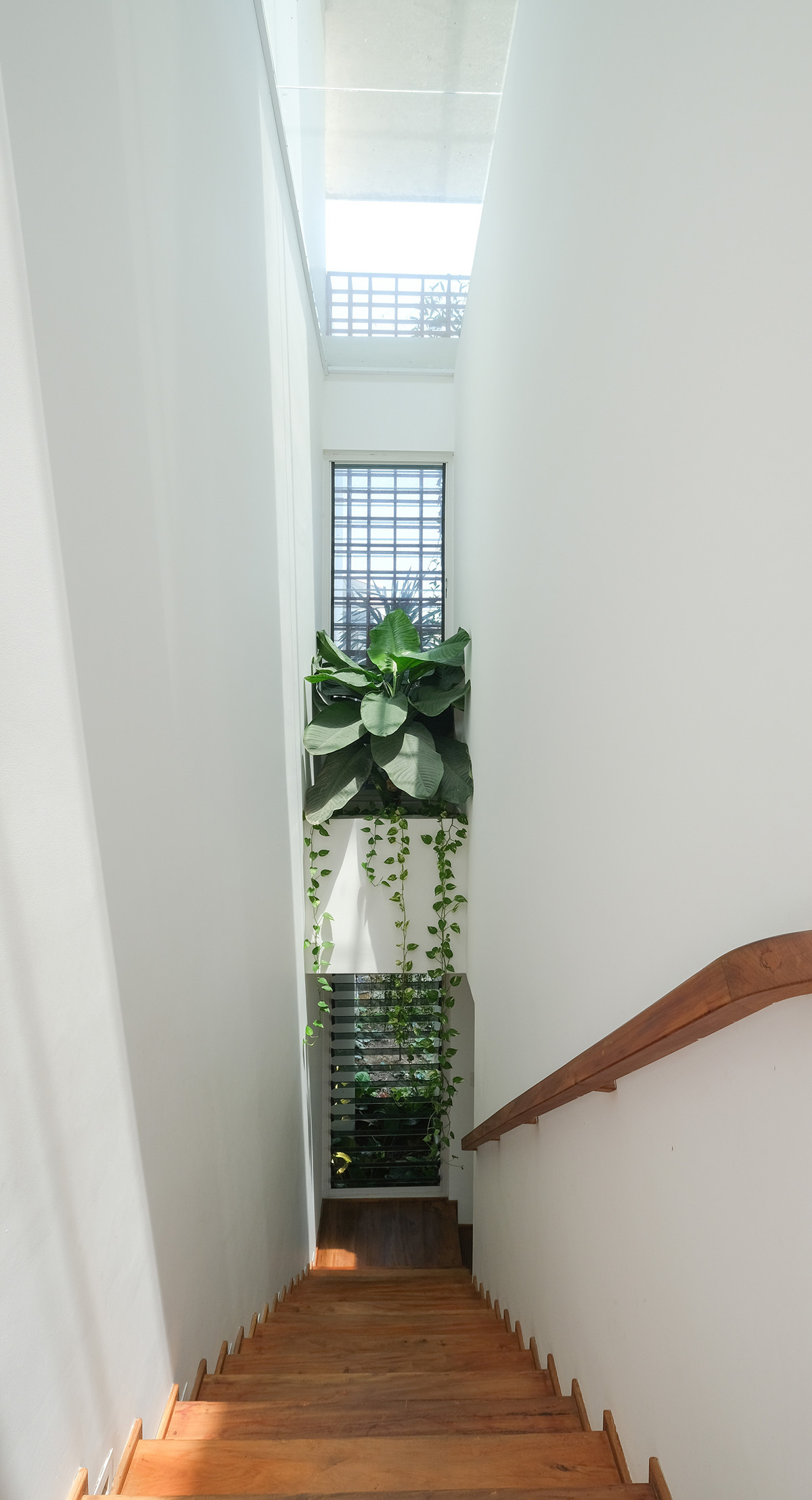 Giải pháp tính toán lấy sáng tự nhiên kết hợp “bẫy nhiệt” giúp thông gió tự nhiên theo phương ngang và phương đứng tập trung cho các không gian chuyển tiếp như cầu thang, hành lang. Các không gian riêng tư và không gian chính nhận ánh sáng chuyển tiếp, phù hợp với mức độ cảm nhận thị giác của mắt người theo từng giai đoạn thời gian trong ngày.