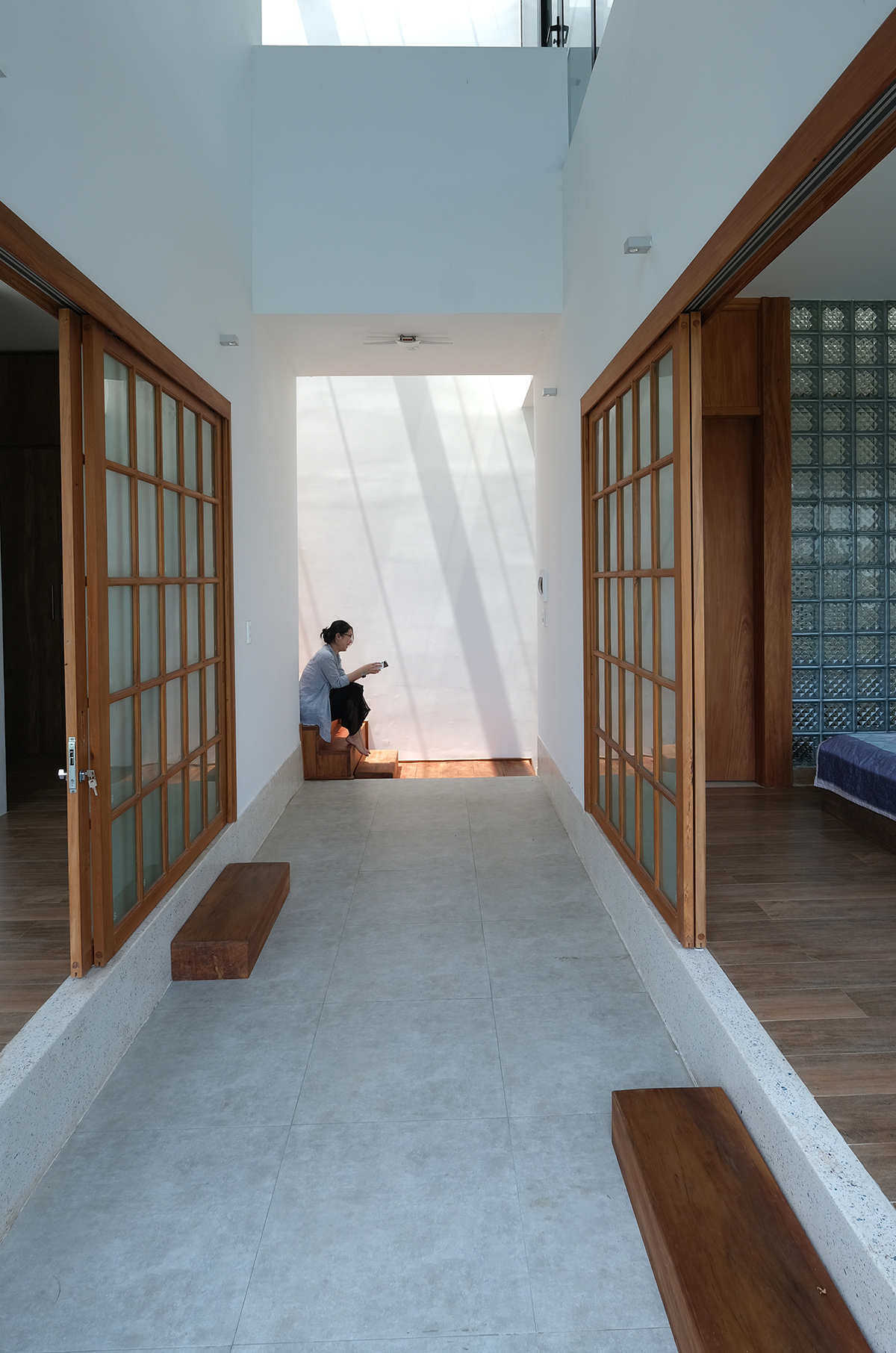 Hệ giếng trời lớn đưa ánh sáng đi khắp nơi trong nhà. Nhờ giếng trời phía trên, cây cối phía dưới vẫn đủ ánh sáng phát triển tốt.