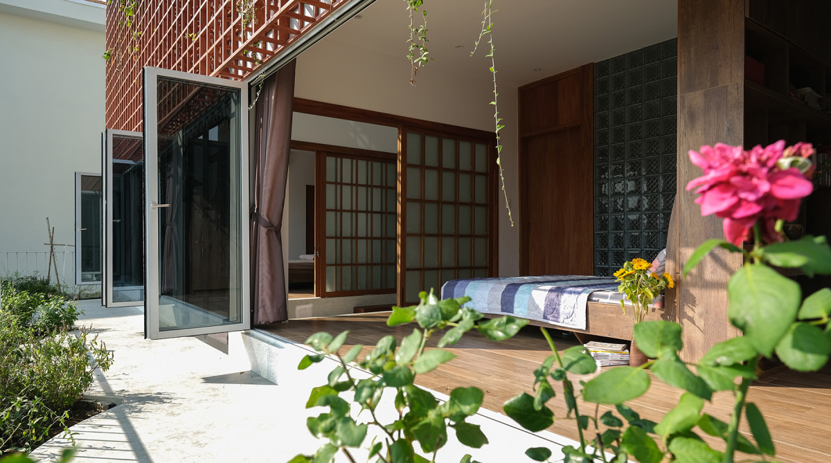 Vì gia chủ muốn có sự gắn kết tối đa giữa bố mẹ và con cái, phòng ngủ bố mẹ kết nối với phòng ngủ hai con bằng một khoảng đệm. Hai phòng ngủ thông nhau giúp bố mẹ có thể quan sát và tương tác với các con nhiều hơn.
