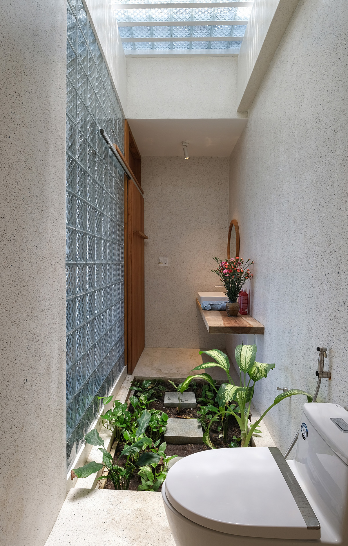Không gian nào cũng có ánh sáng và cây xanh tươi mới, dù đó là phòng vệ sinh. Gạch kính được sử dụng tại khu vực này nhằm lấy sáng cũng như tạo điểm nhấn trang trí.