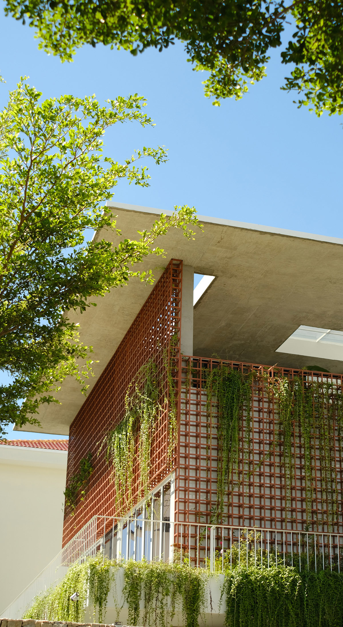 Giàn lam đỏ từ vật liệu nhôm giả gỗ tạo thành lớp áo mỏng bên ngoài và được "may" bằng các loại cây leo. Đây là lớp che chắn bức xạ mặt trời, tạo lớp rèm xanh thị giác từ bên trong cũng như bên ngoài. Phần mái bê tông thô vươn xa tạo thành hiên che mưa nắng. Đây đều là những yếu tố đặc trưng của kiến trúc nhiệt đới.