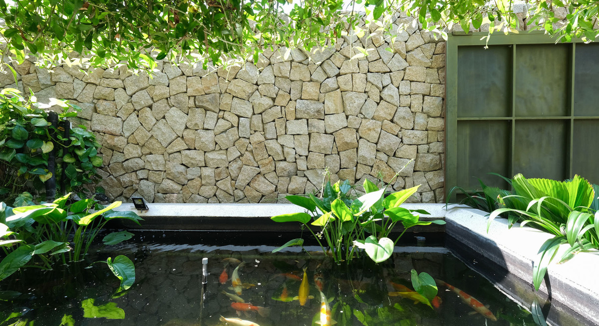 Ngay cổng chính, hệ cây xanh và mặt nước là hồ cá Koi tạo cảm giác gần gũi thiên nhiên. Đây là không gian thư giãn cho cả nhà. Tường quanh nhà được ốp bằng đá chẻ đục thô, một loại đá đặc trưng sẵn có tại địa phương với chi phí phù hợp, độ cảm vật liệu đẹp và tính bản địa rõ nét.
