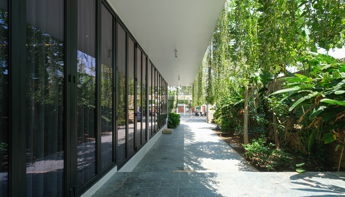 Thiết kế mở giúp không gian gắn kết với thiên nhiên nhiều nhất có thể. Ngoài tác dụng giảm nhiệt, cây xanh bố trí khắp nơi kết hợp với ánh nắng tô điểm thêm cho những bức tường trắng.