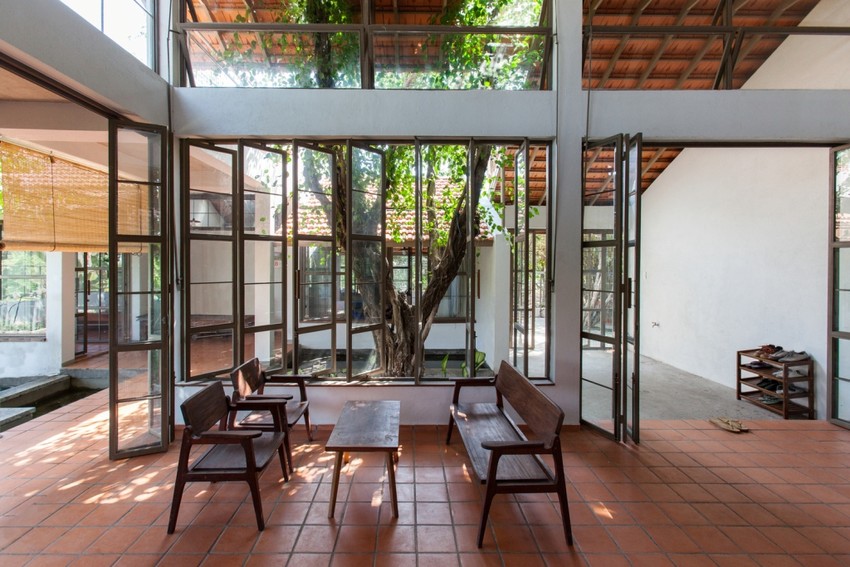 Khi tiếp nhận công trình, kiến trúc sư rất ấn tượng bởi 11 cây xanh hiện có và có tầm nhìn rộng mở. Theo đó, kết cấu nhà được thiết kế dưới tán cây của những cây xanh này.