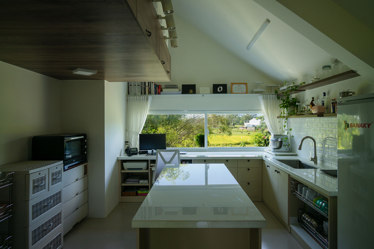 Khu vực làm bánh (gia chủ là thợ làm bánh) với gam màu trắng chủ đạo tạo cảm giác sạch sẽ, gọn gàng.