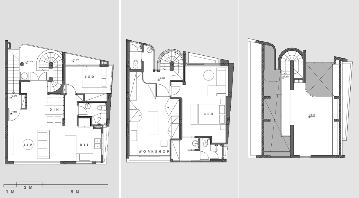 Nhược điểm nữa của công trình là nằm tại địa phương thường xuyên phải đón những trận lũ với mực nước dâng cao 1,2-1,5m. Diện tích đất nhỏ với mật độ công năng dày đặc cũng là đề bài khó với đội ngũ thiết kế. Bởi vậy, giải pháp đưa ra là bỏ trống không gian tầng một, đưa công năng chính lên các tầng trên.