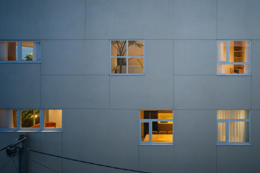 Với hình dáng khu đất, kiến trúc sư Rear studio cố gắng để công trình không trở thành một khối hộp mỏng và cao. Thay vì thiết kế mặt đứng cho chính công trình, kiến trúc sư đề xuất một mặt đứng trải dài theo khu đất.