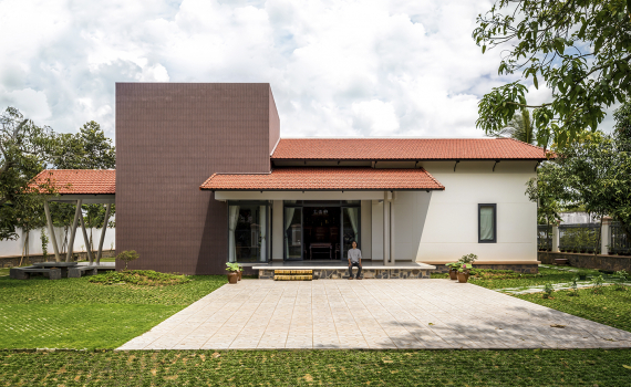 Sân vườn hạn chế bê tông, mà thay vào trồng cỏ để có thể hút nước mưa tránh thoát nước không kịp, và giảm bức xạ nhiệt. Phần hệ khung đỡ mái ngói thay vì dùng gỗ như truyền thống, KTS thiết kế hệ khung sắt sơn đen để bảo vệ cây xanh và môi trường.
