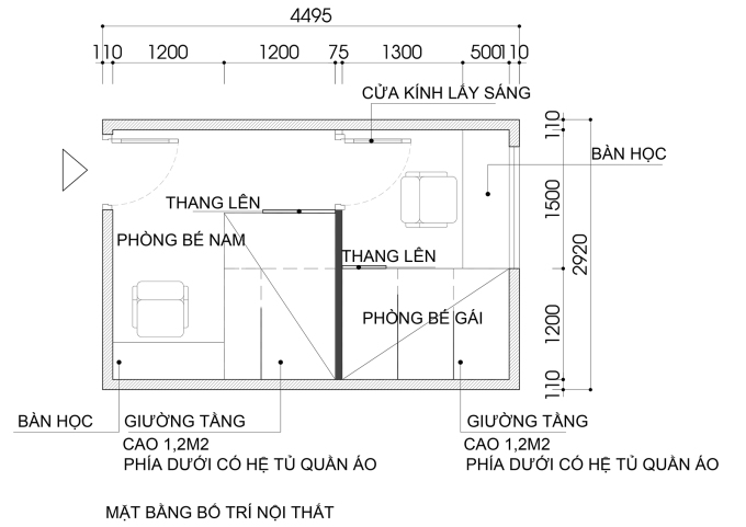 Trường hợp 1: Với diện tích 15 m2 hoặc nhỏ hơn, sử dụng giường tầng vẫn là phương án tối ưu. Theo đó nên bố trí giường ngủ phía trên cách mặt sàn 1-1,2 m để phía dưới có thể tận dụng bố trí các hệ thống tủ quần áo hoặc tủ để đồ. Thang lên xuống nên sử dụng loại thang khỉ, tránh mất nhiều diện tích.