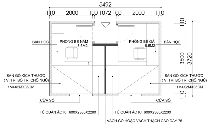 Mặt bằng bố trí nội thất cho phòng lớn hơn 15 m2, tách biệt thành hai phòng riêng rẽ cho bé trai và bé gái. Ảnh: Trương Thành Trung
