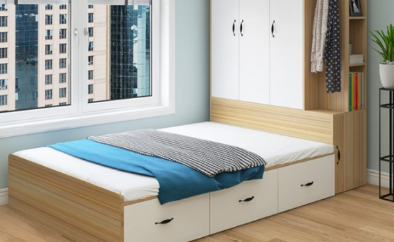 Để diện tích rộng rãi hơn, nên đóng giường ngủ liền tủ quần áo. Đây là giải pháp tiết kiệm không gian hiệu quả hơn so với việc đặt giường và tủ riêng một góc khác nhau. Mẫu giường ngủ liền tủ khai thác tối đa không gian sử dụng và lưu trữ đồ đạc. Phần giường ngủ được thiết kế có kèm ngăn kéo bên dưới để đựng chăn, gối, drap giường dự phòng.