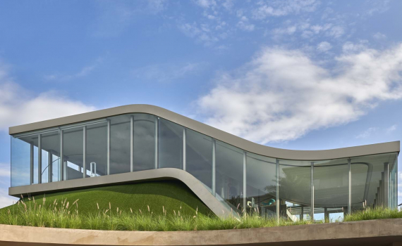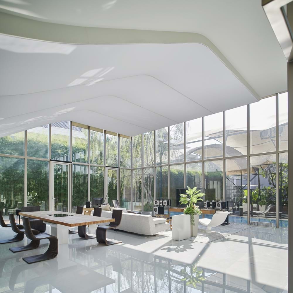 Ngôi nhà được thiết kế theo hướng mở, các phần tường được thay thế bằng các tấm kính chịu lực bản lớn. Hệ thống điều hòa không khí được lắp âm dưới sàn thay vì trên trần nhà.