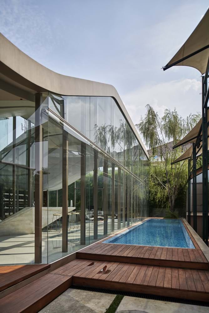 Hồ bơi nhỏ phía bên hông nhà vừa tạo điểm nhấn cho không gian, vừa có vai trò làm cân bằng, dịu mát không gian, phục vụ nhu cầu thư giãn của gia chủ.