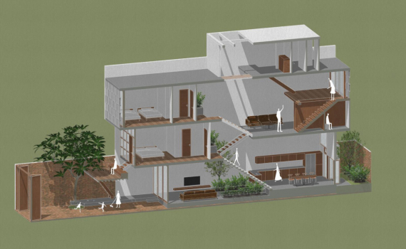 Không gian bên trong được thiết kế lệch tầng. Đây là kiểu nhà bố trí các tấm sàn đặt so le, lệch nhau giữa các tầng tạo sự độc đáo khi nhìn từ trên xuống, đồng thời tận dụng tối đa khu vực cầu thang trở thành giếng trời để lấy sáng, lấy gió.