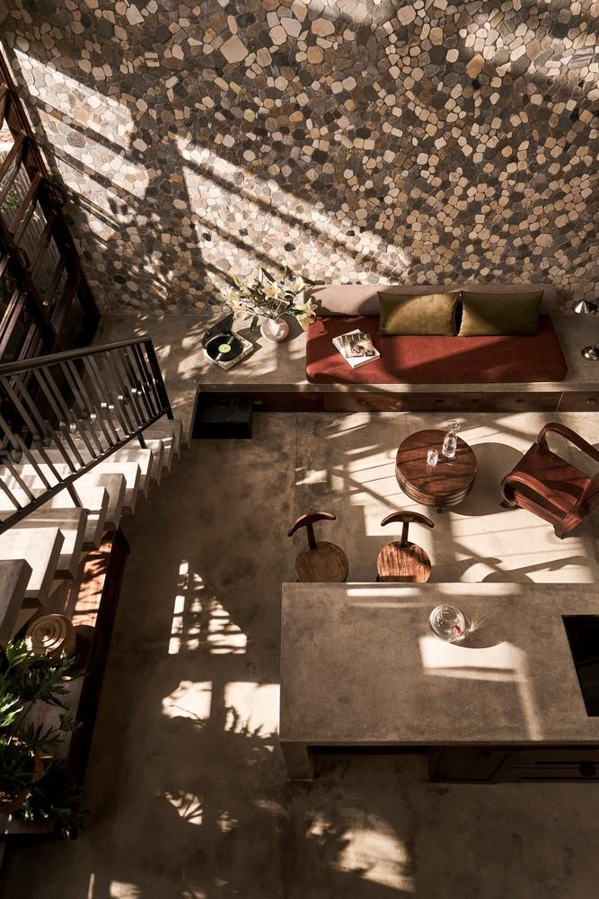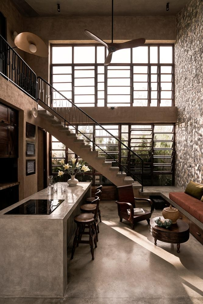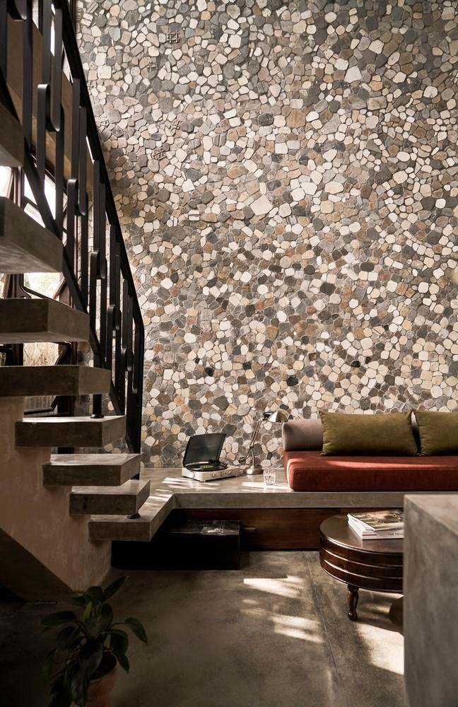 Để tăng thêm vẻ mộc mạc cho ngôi nhà, KTS đã sử dụng các vật liệu như đá, gỗ, bê tông và đặc biệt là ngói đất sét nung để lợp mái - một loại vật liệu mang lại nhiều hoài niệm.
