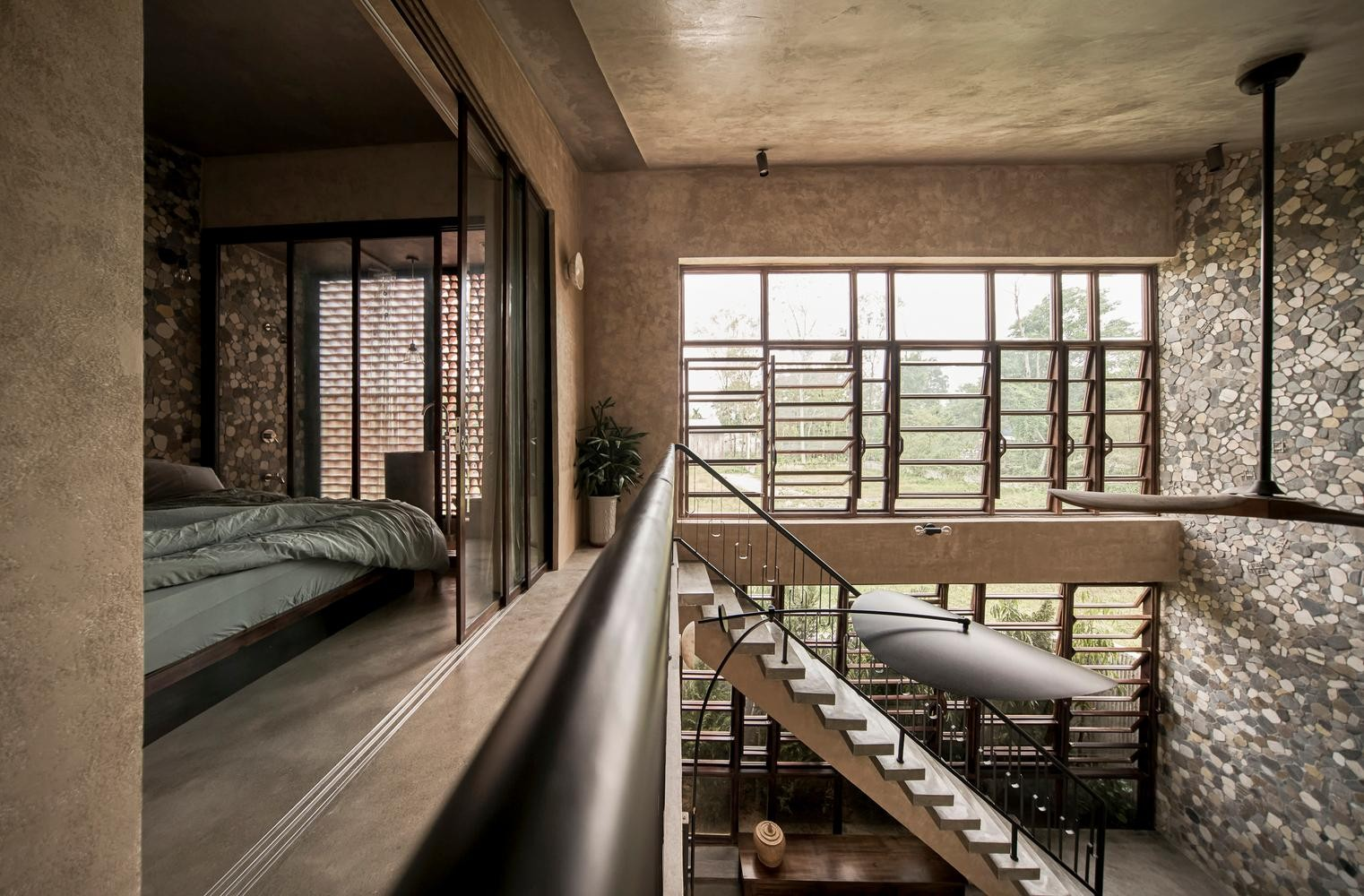 Ngoài ra, KTS sử dụng lam gỗ kính phía sau nhà và khối đất nung tạo hiệu ứng cho khu vệ sinh, mang lại sự lưu thông không khí tốt nhất cho ngôi nhà cũng như sự riêng tư cần thiết.
