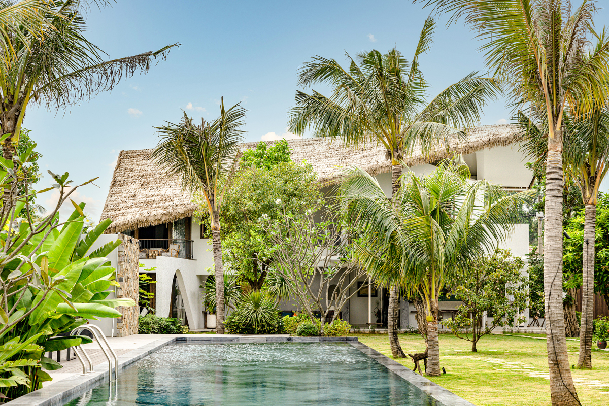 Phần mái dốc vút cao không chống bởi chiếc cột nào được sử dụng lá dừa nhân tạo thay cho lá dừa tự nhiên. Ngoài ưu điểm bền bỉ với thời gian còn giúp giảm thiểu các sự cố ngoài ý muốn trong quá trình sử dụng như bảo trì hoặc phải thay thế.