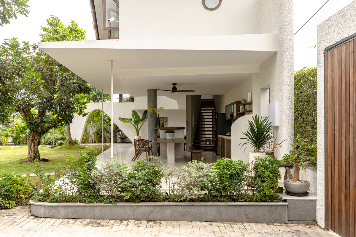Với cấu trúc nhà trong nhà, tầng trệt gồm một phòng ngủ, phòng khách bếp và ăn. Phía trên là hai khối nhà độc lập được treo lơ lửng, lấy cảm hứng từ hình ảnh những ngôi nhà sàn ven sông.