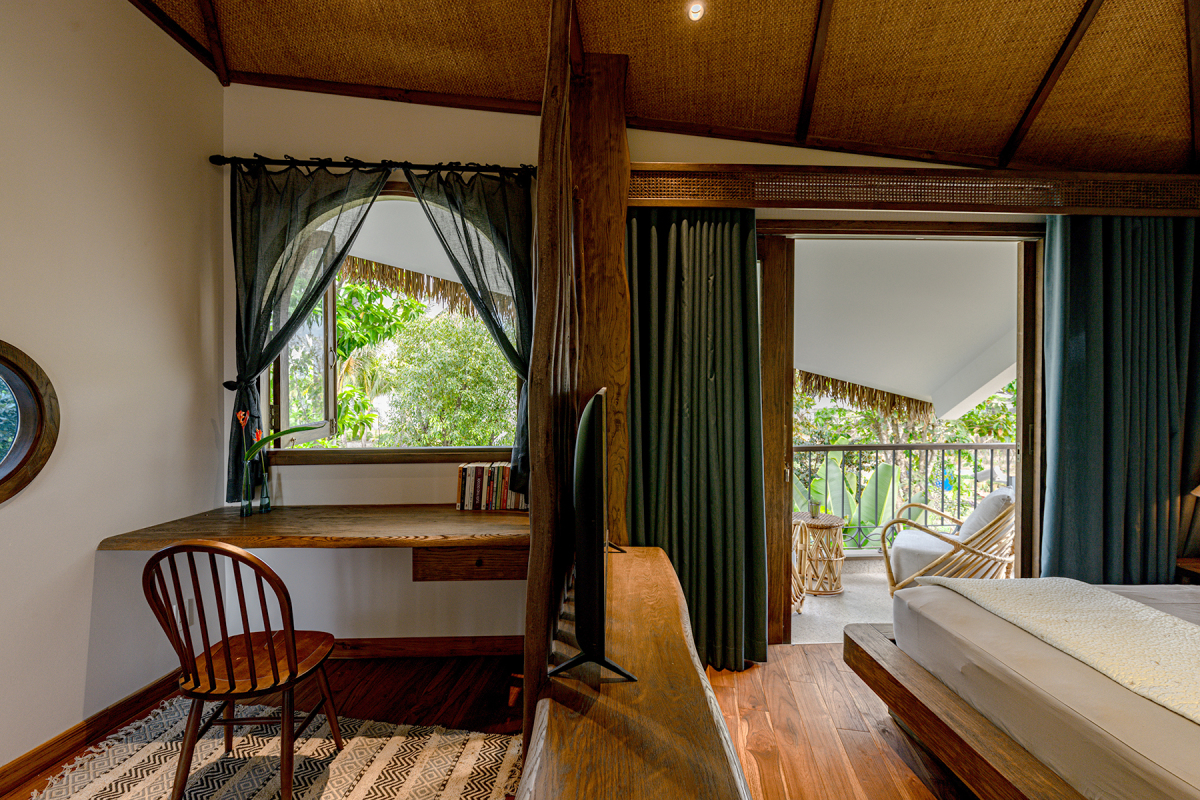 Phần hiên nhỏ, dài được giật cấp cao hơn một chút, tạo lằn ranh phân định trong- ngoài nhà. Nội thất mang phong cách thô mộc, gần gũi với gỗ trần, cói, mây tre... những vật liệu gợi nhớ hình ảnh về con thuyền trên sông.