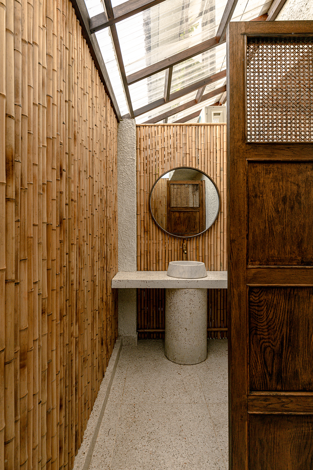 Độ cứng của tre cao gấp 2-3 lần các loại gỗ thông thường nên ở khu vực vệ sinh ngoài trời, kiến trúc sư đã sử dụng vách ngăn tre để chống chịu với thời tiết khắc nghiệt và các tác động mạnh khác.