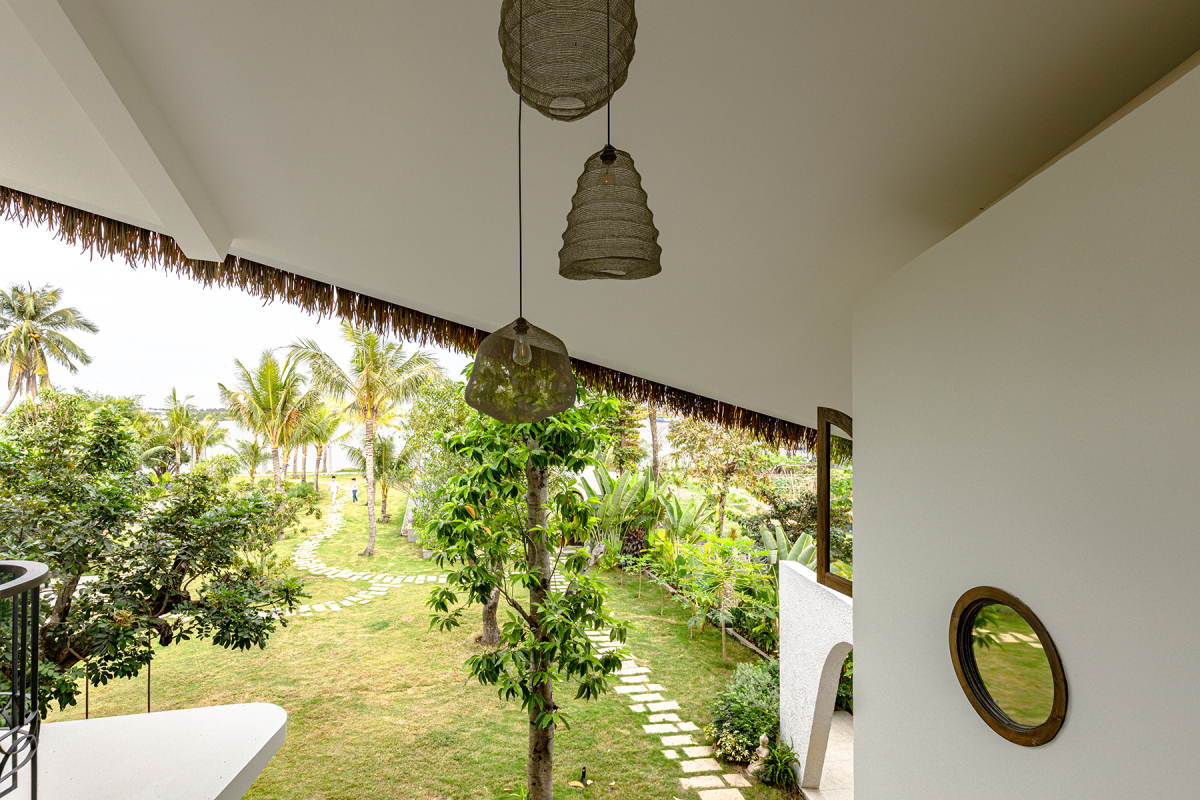 Hướng nhìn từ hành lang tầng một phóng tầm mắt về phía sân vườn và sông Đồng Nai. Sân vườn rộng với đầy đủ chức năng, khu nuôi cá, chăn nuôi, sinh hoạt ngoài trời phù hợp với nhiều mục đích sử dụng của gia chủ.