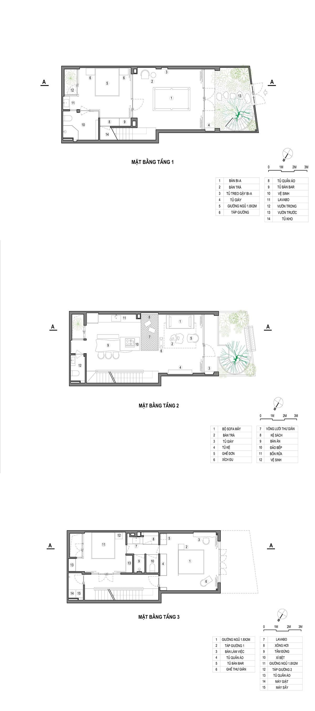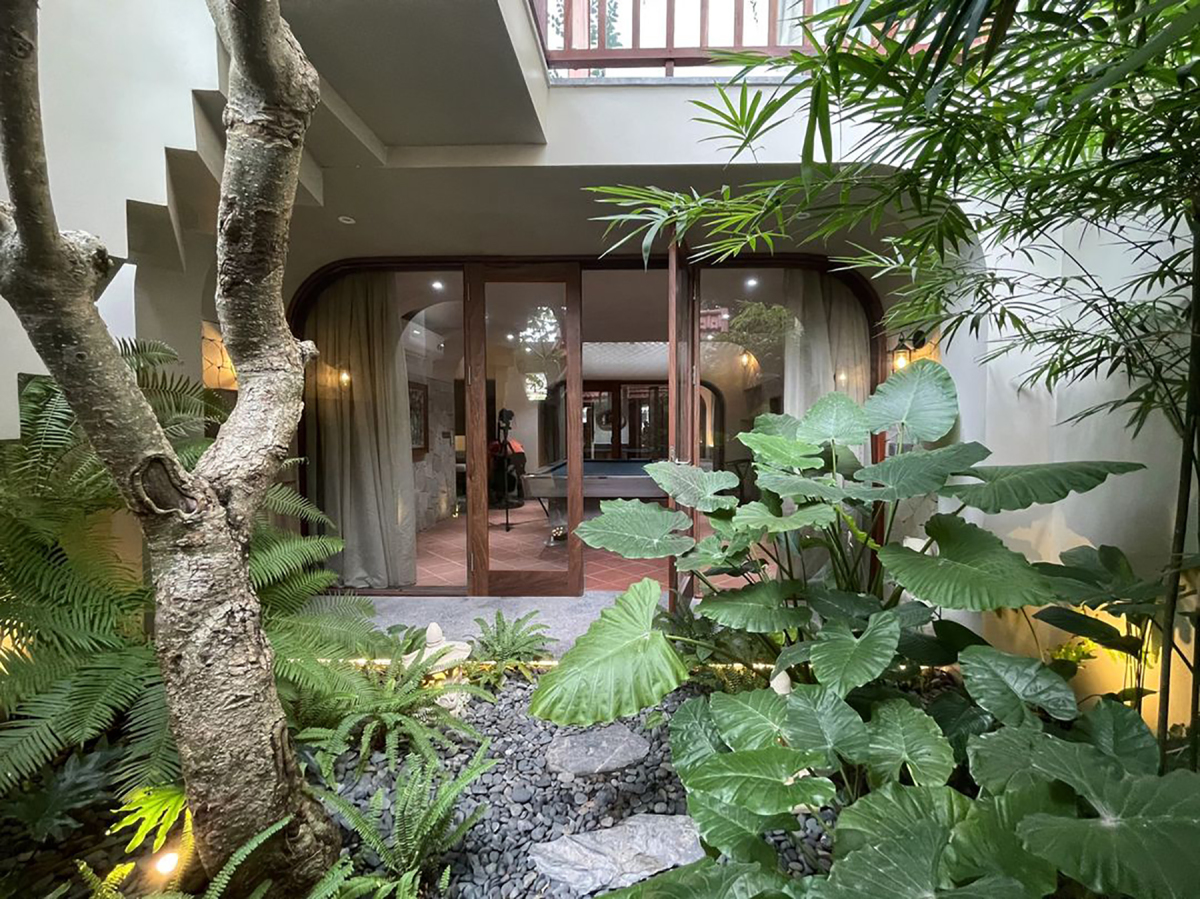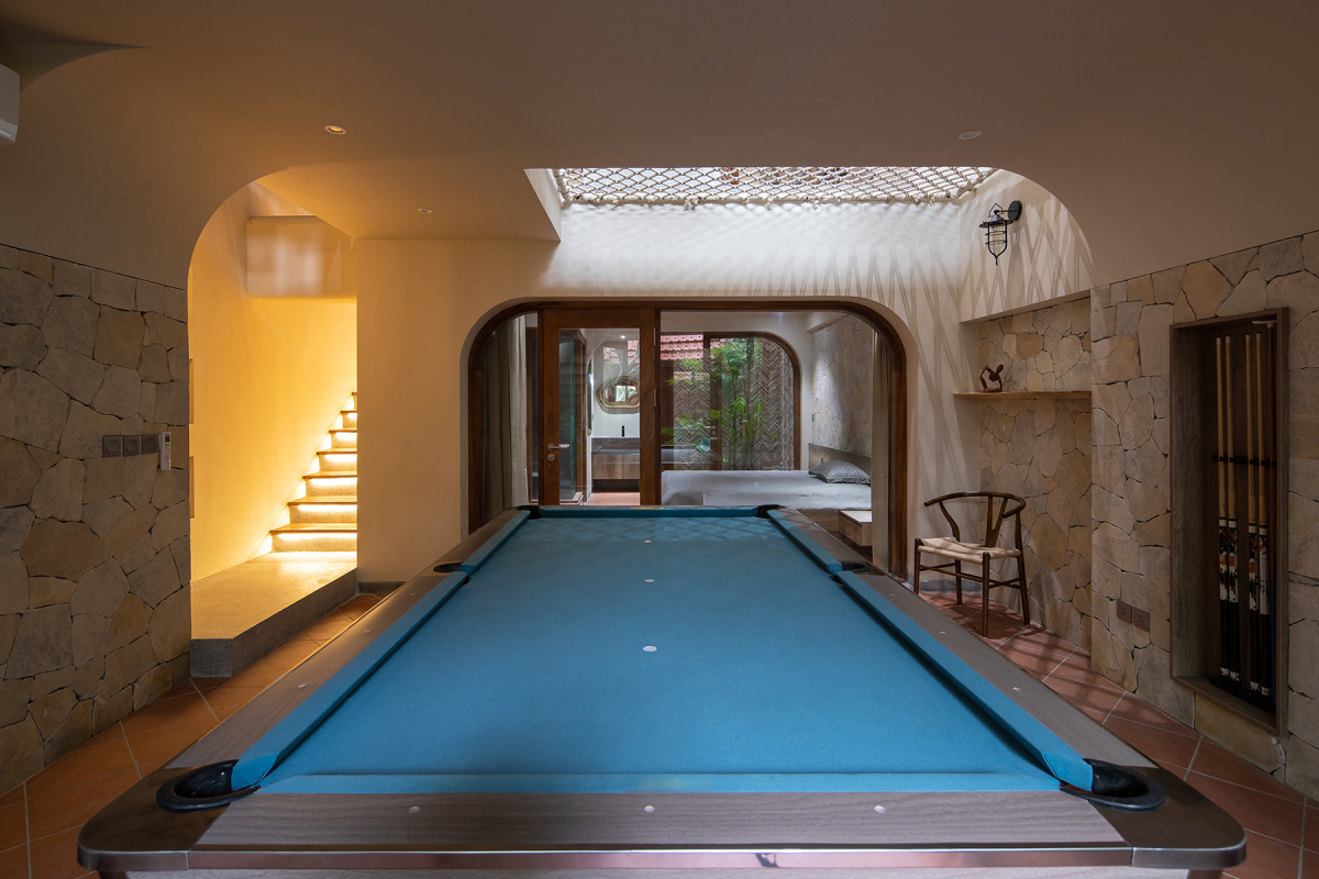 Phòng ngủ cho khách được bố trí tại tầng một kết hợp bàn bi-a là không gian vui chơi cho gia đình, bạn bè. Hai giếng trời được bố trí ở sân sau và khu vực cầu thang, kết hợp với khu vườn phía trước giúp công trình đủ ánh sáng và gió trời.