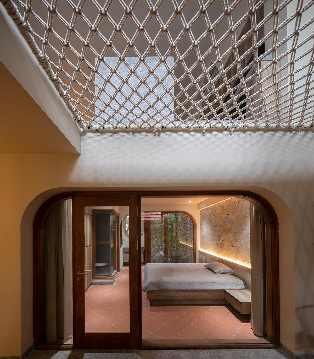 Chiếc võng được bện hai lớp, chịu được 500 kg. Không chỉ tạo thẩm mỹ, chiếc võng lưới còn có công dụng lấy sáng cho khu vực giữa tầng một. Đây cũng nơi trung chuyển gió mát, khí trời, là nơi giao lưu của mọi người dù đứng ở hai tầng khác nhau.