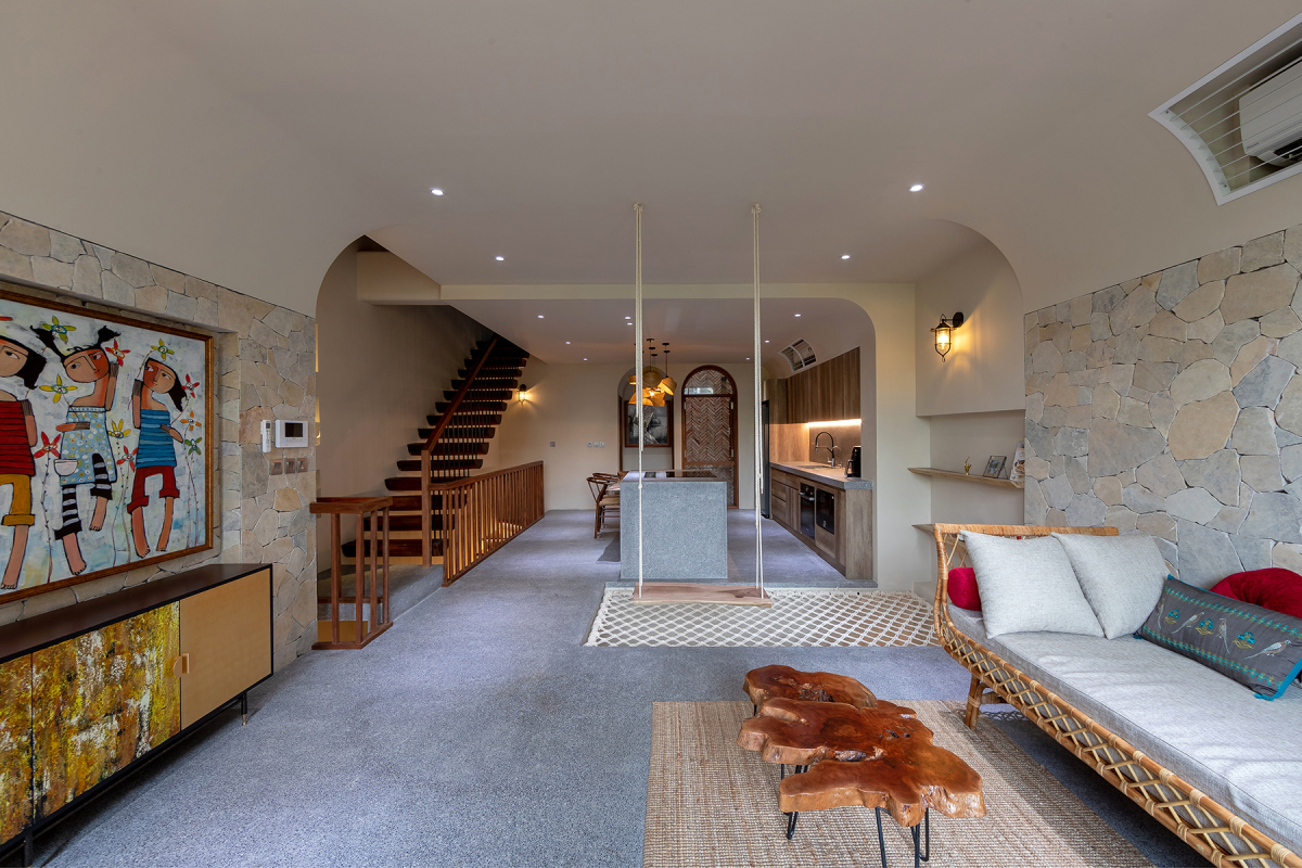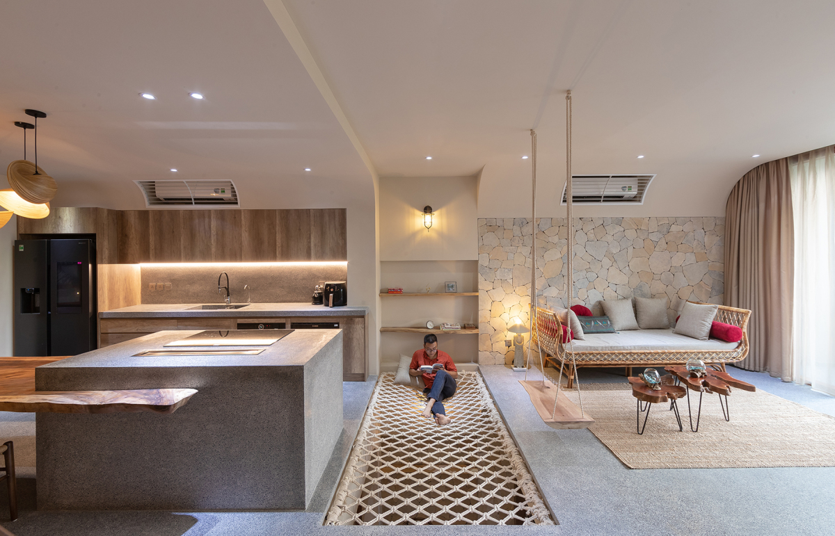 Khu vực tầng hai giống như một sân chơi gia đình với không gian mở, nơi các thành viên có thể giao tiếp trong lúc đọc sách, chơi xích đu, ăn uống hay chuẩn bị bữa tối.