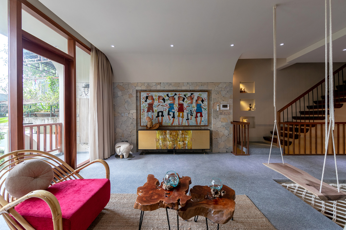 Để kết nối không gian giữa tầng một và tầng hai, kiến trúc sư đã thiết kế khoảng thông tầng lên thẳng phòng khách, tại đó được bố trí thêm chiếc võng lưới vừa tăng tính giải trí, vừa tăng tính thẩm mỹ cho ngôi nhà.
