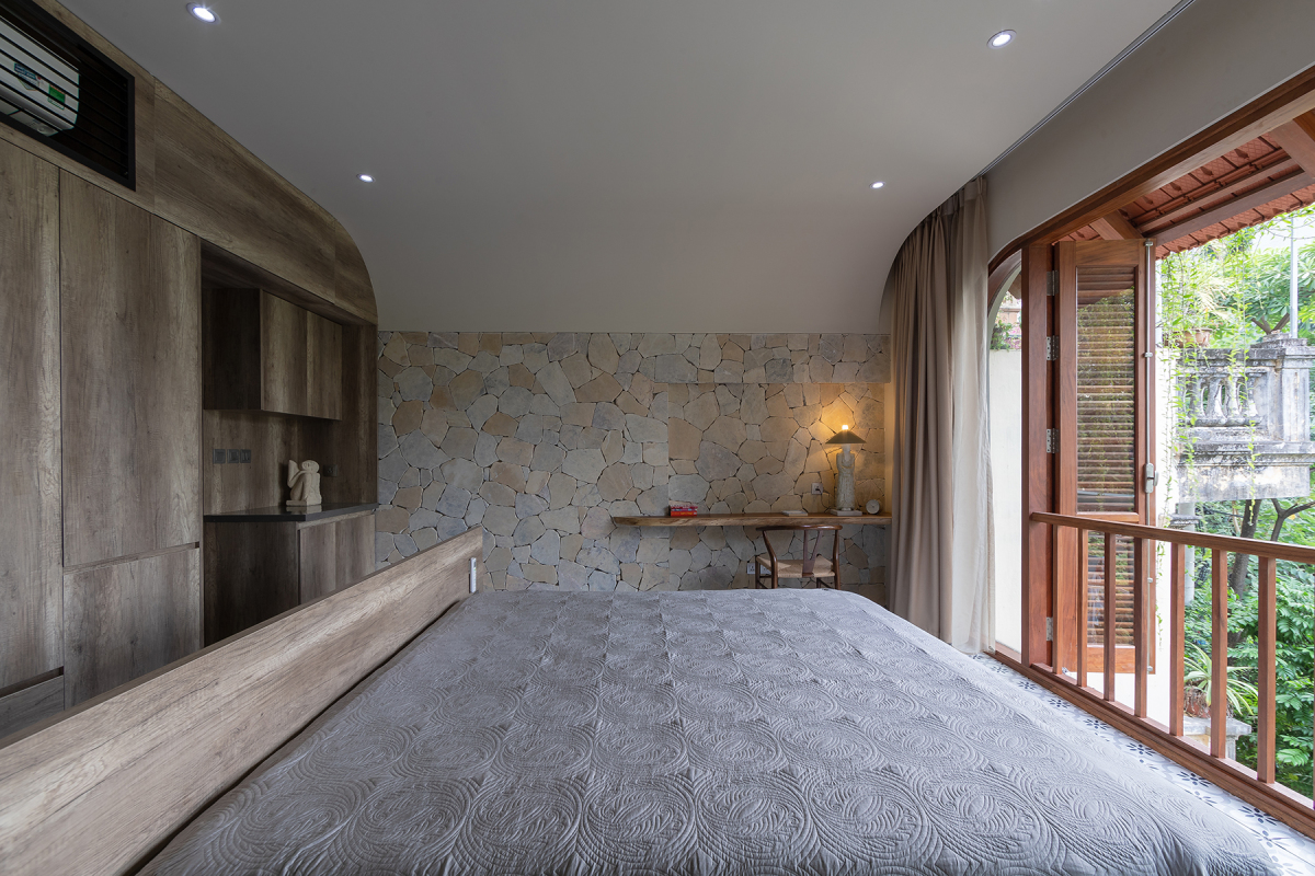 Đá xẻ hai phân tự nhiên được kiến trúc sư dùng ốp tường. Việc sử dụng đá ốp không chỉ tăng tính thẩm mỹ mà màu sắc của vật liệu gần như không thay đổi theo thời gian. Ưu điểm này thể hiện rõ ý đồ của kiến trúc sư là hướng tới những gì tự nhiên nhất.