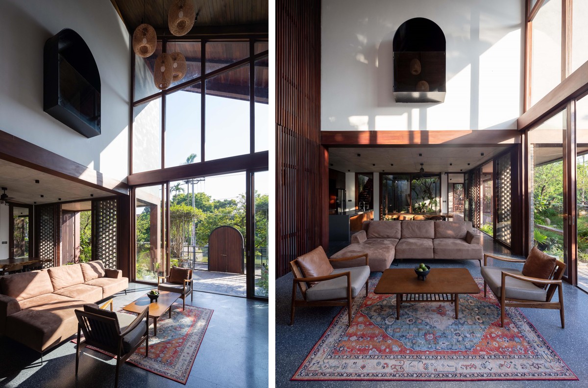 Điểm đặc biệt bên trong không gian của ngôi nhà là hai khoảng trống lớn. Khoảng trống thứ nhất là khoảng thông tầng phía phòng khách, nhằm kết nối không gian phòng ngủ trẻ phía trên qua một chiếc cửa sổ vòm.