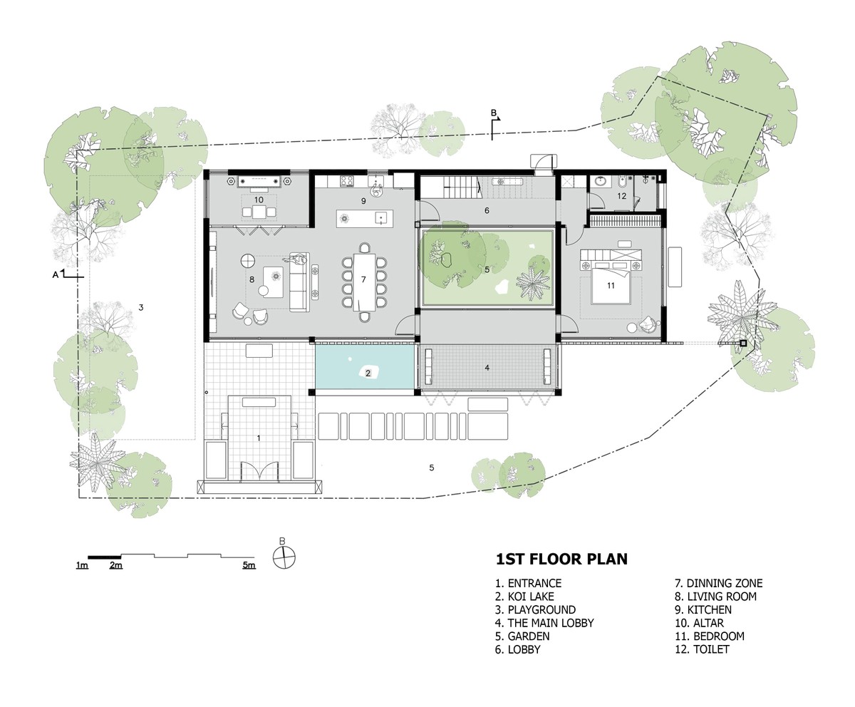Khu đất với mặt tiền rất dài nhưng chiều sâu lại hạn chế, do đó công trình nằm khá sát so với ranh giới khu đất, diện tích dành cho cảnh quan sân vườn bị hạn chế.
