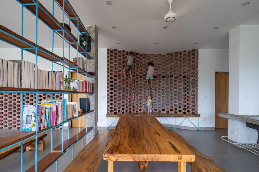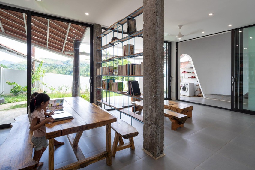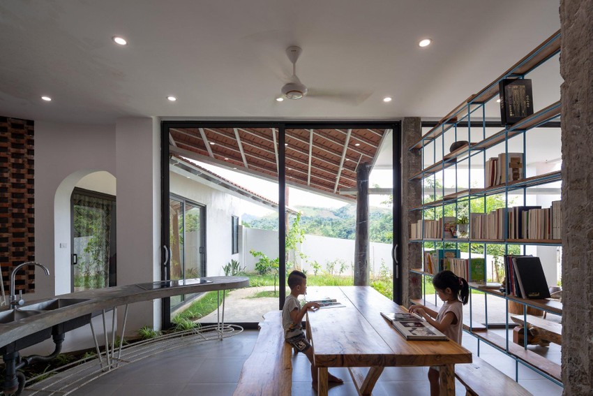 Không gian sinh hoạt của gia đình đã được đưa xuống dưới (tầng bán âm), nơi mọi người có thể nhìn thấy cánh đồng lúa.