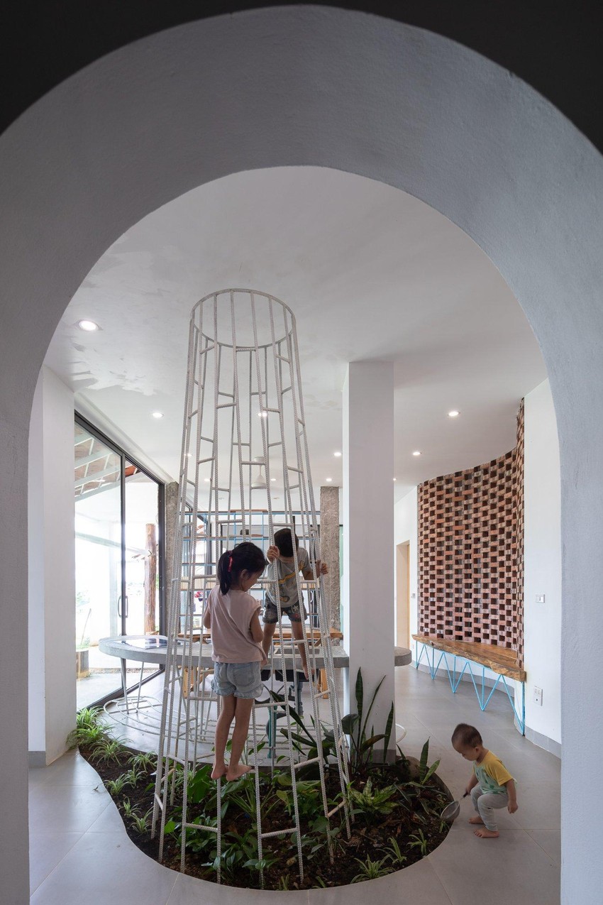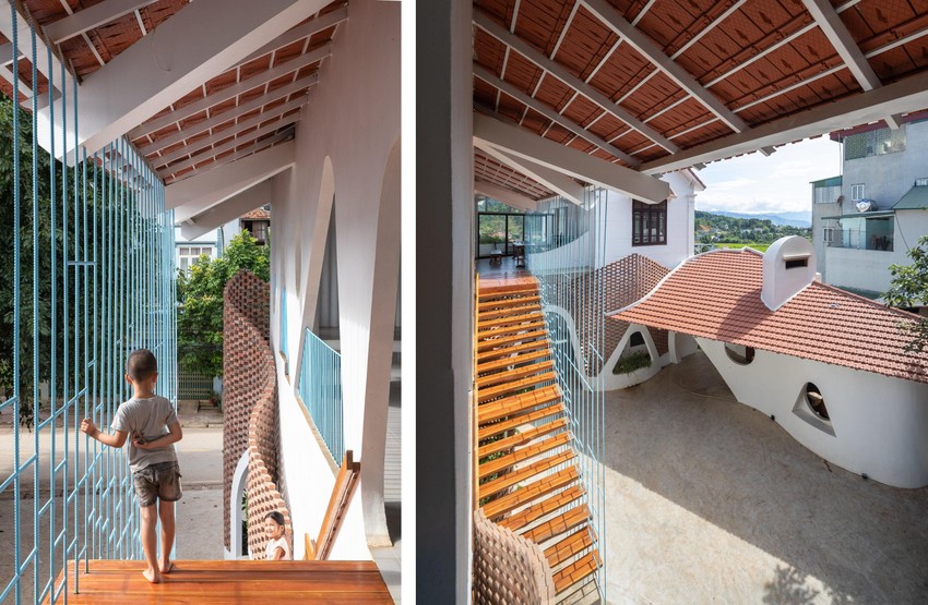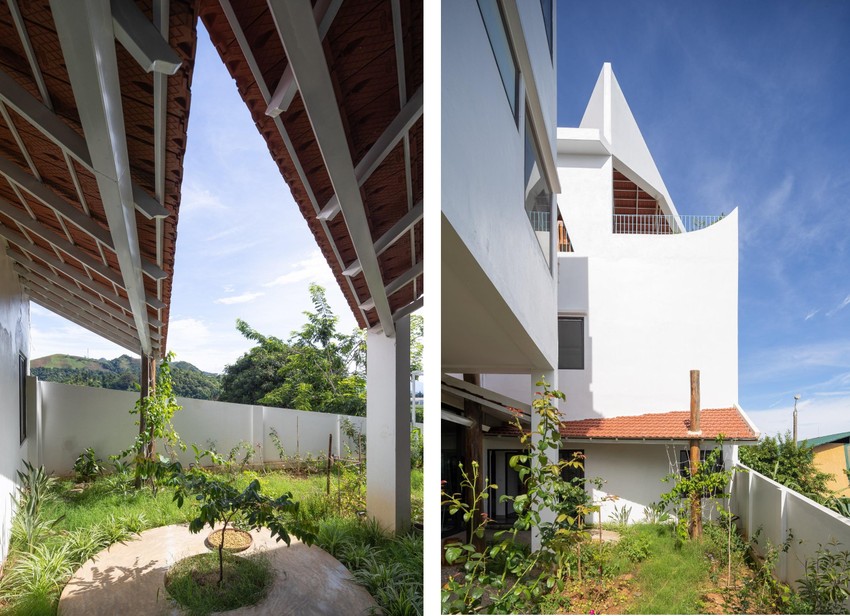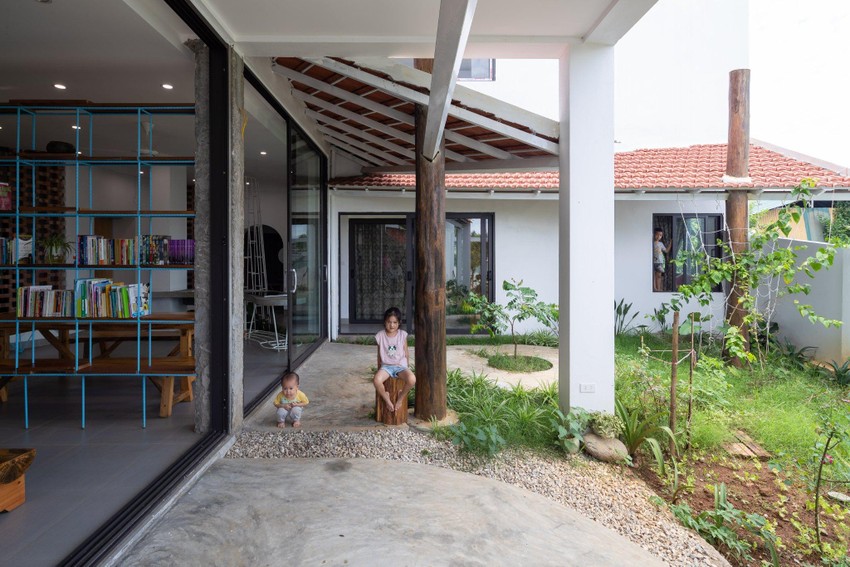Sân trên dành cho khu vực nhà hàng và sân dưới dành cho khu vực sinh hoạt được tổ chức để phù hợp với các chức năng khác nhau.