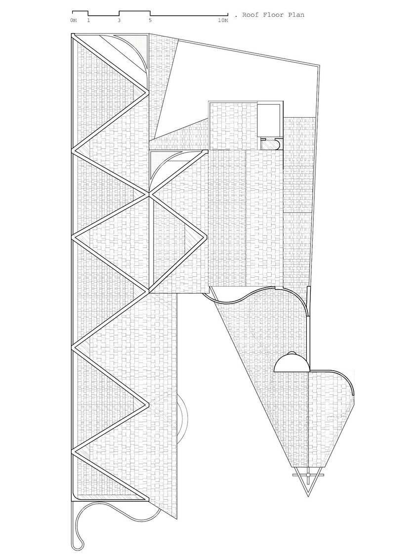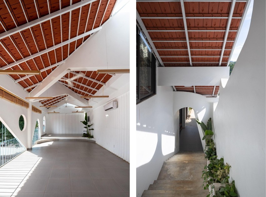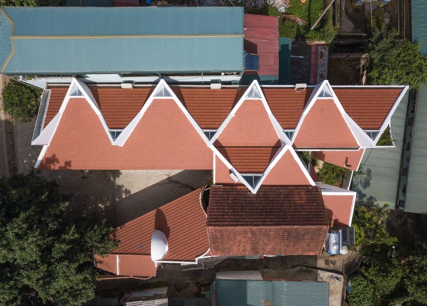 Phần mái nhà phòng hội trường được đặt chéo 45 độ, đan xen với mái ngói của ngôi nhà cũ.