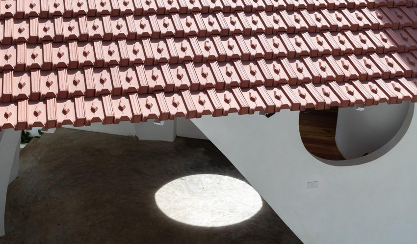 Màu đỏ của ngói mới và cũ hòa quyện tạo nên nét đặc biệt nhưng hài hòa.