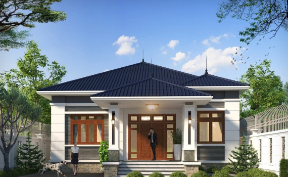 Nhà mái Nhật 1 tầng giả biệt thự với 3 phòng ngủ, 1 gác lửng. Thiết kế ngoại cảnh bắt mắt, tinh tế. Phần mái ngói xanh nổi bật trên nền sơn trắng. Hai hòn đá phong thủy đặt hai bên cửa ra vào thể hiện sự vững chãi, bền vững và thịnh vượng. Một mẫu thiết kế phù hợp với gia chủ làm kinh doanh.
