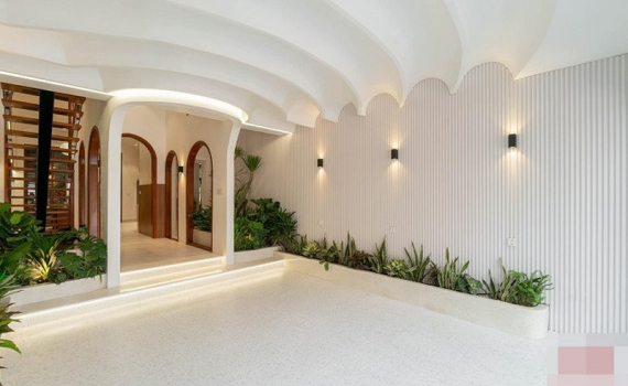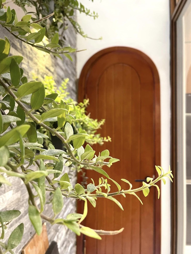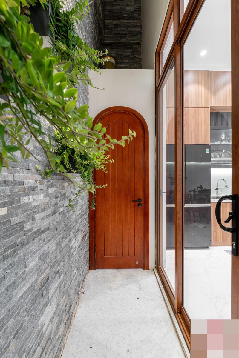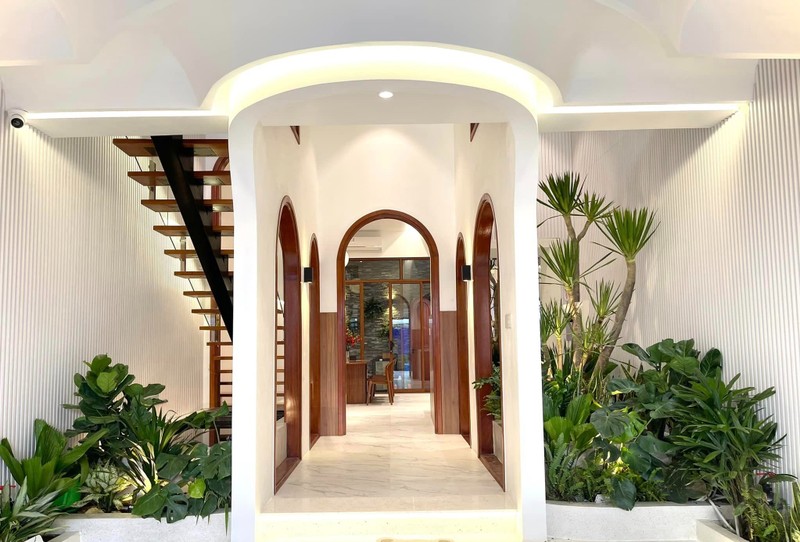 Khối cửa vòm ở giữa dẫn vào các khu vực chức năng và tầng 2. Để khu vực này không bị đơn điệu, anh Quý bố trí nhiều cây xanh.