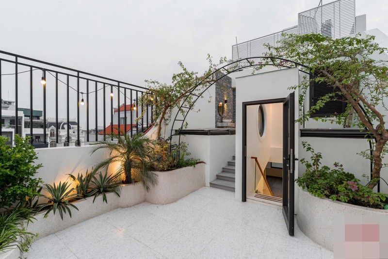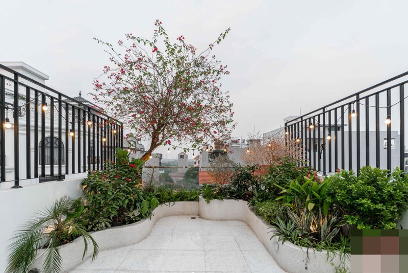 Khu sân thượng là nơi chill thú vị của cả gia đình với cách bày trí đẹp, khoa học, để hai vợ chồng gia chủ thoải mái trồng cây cối.